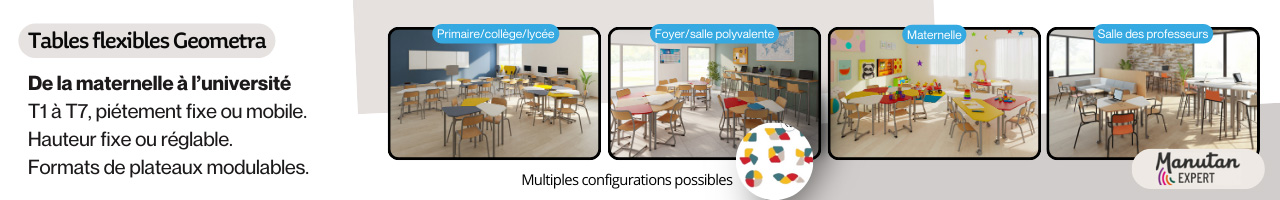 Dans les établissements de l’enseignement supérieur, la salle de classe est bien plus qu’un lieu accueillant des cours. C’est un véritable petit théâtre où s’enchainent les séances de travail à plusieurs, les présentations des élèves, les rencontres avec toutes sortes d’intervenants extérieurs, et même les activités extrascolaires. Cet espace dédié à l’éducation et à la transmission des connaissances se doit d’être accueillant, confortable et adapté aux besoins de chaque professeur. Afin que chaque élève se sente bien, il peut s’installer sur une chaise individuelle avec tablette de travail intégrée, sur une grande table commune ou sur une assise à hauteur réglable. Pour l’aménagement des espaces partagés et des salles de classe, Manutan Collectivités sélectionne des meubles fonctionnels, faciles à déplacer et à entretenir, pour créer en un instant le cadre de travail idéal, même dans de petites pièces.