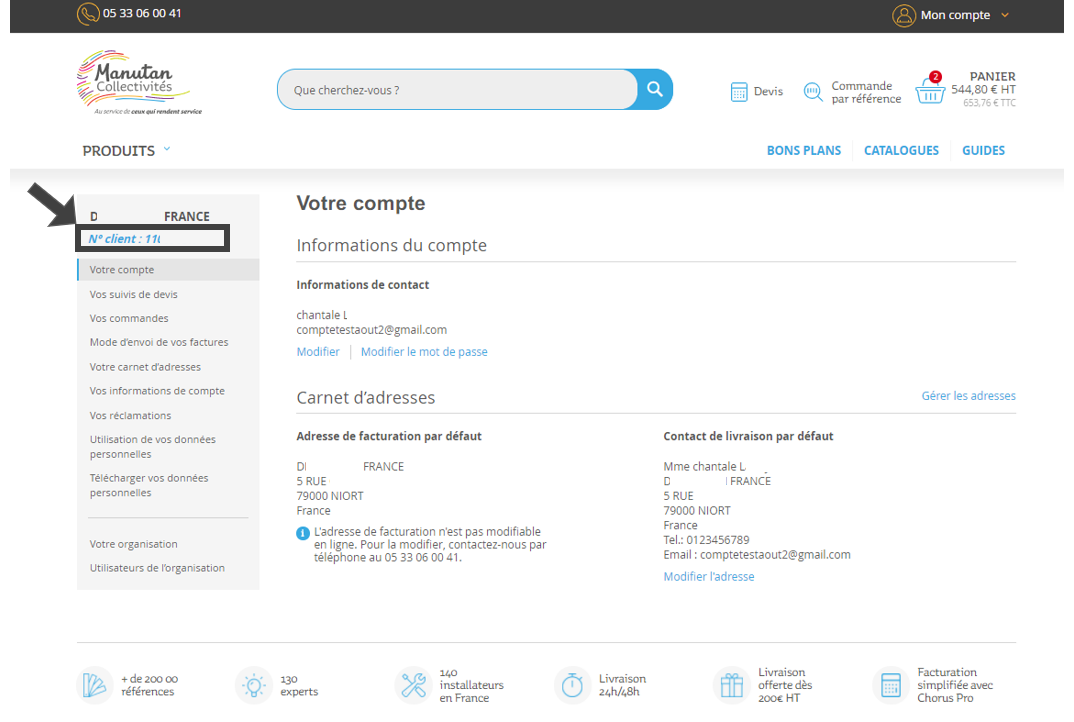 Pour trouver le numéro client de l'établissement auquel vous êtes rattaché, rendez-vous dans votre espace client. Dans le menu latéral situé à gauche, votre numéro de client apparaît en bleu.