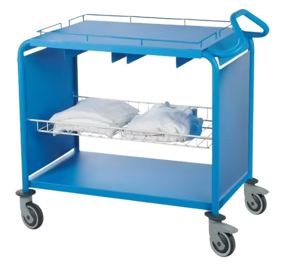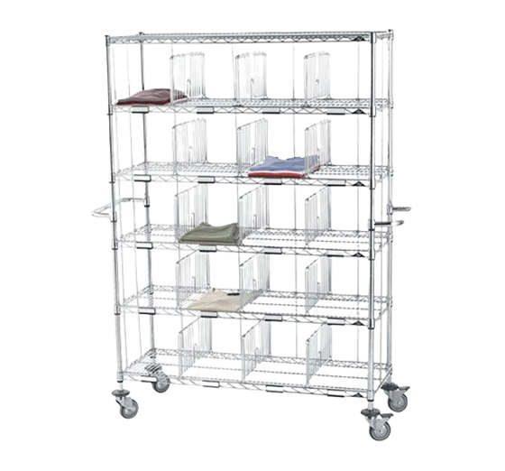 Stockage sur des rayonnages filaires et distribution du linge plat avec des avec des chariots de change fermés, pour respecter l'hygiène du linge.