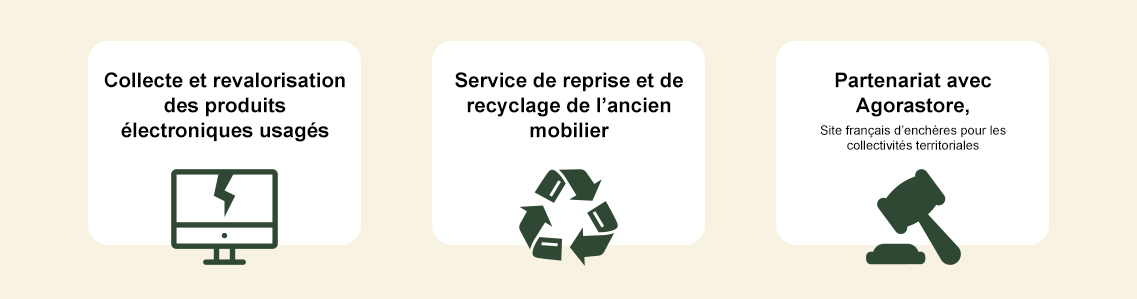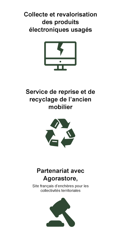 Pour vous accompagner à entrer dans l’économie circulaire, vous soutenir dans votre démarche RSE et vous aider pour une consommation plus responsable, Manutan Collectivités a développé, pour vous, plusieurs services :
