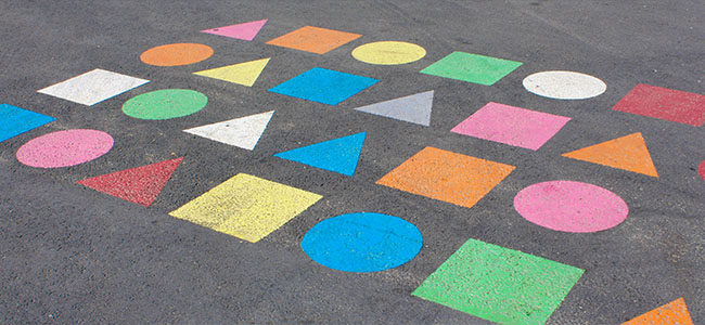 Imaginer un « jeu des statues » à partir de ronds ou cases multicolores dessinés sur le sol : sur un fond musical, les enfants courent en tous sens. La musique s’arrête, ils doivent stationner sur une forme géométrique. Sur un rond, ils doivent lever les bras. Sur un carré, ils doivent s’accroupir, etc. L’idée est d’utiliser les formes tracées au sol et de faire varier les règles à chaque partie.
