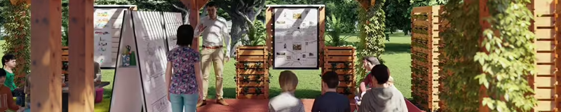 ✔ Intégrer un espace de classe dehors avec tous les équipements et le mobilier nécessaires pour travailler « comme à l’intérieur » : tableaux blancs, poufs, tables-bancs et pergola pour protéger les enfants du soleil