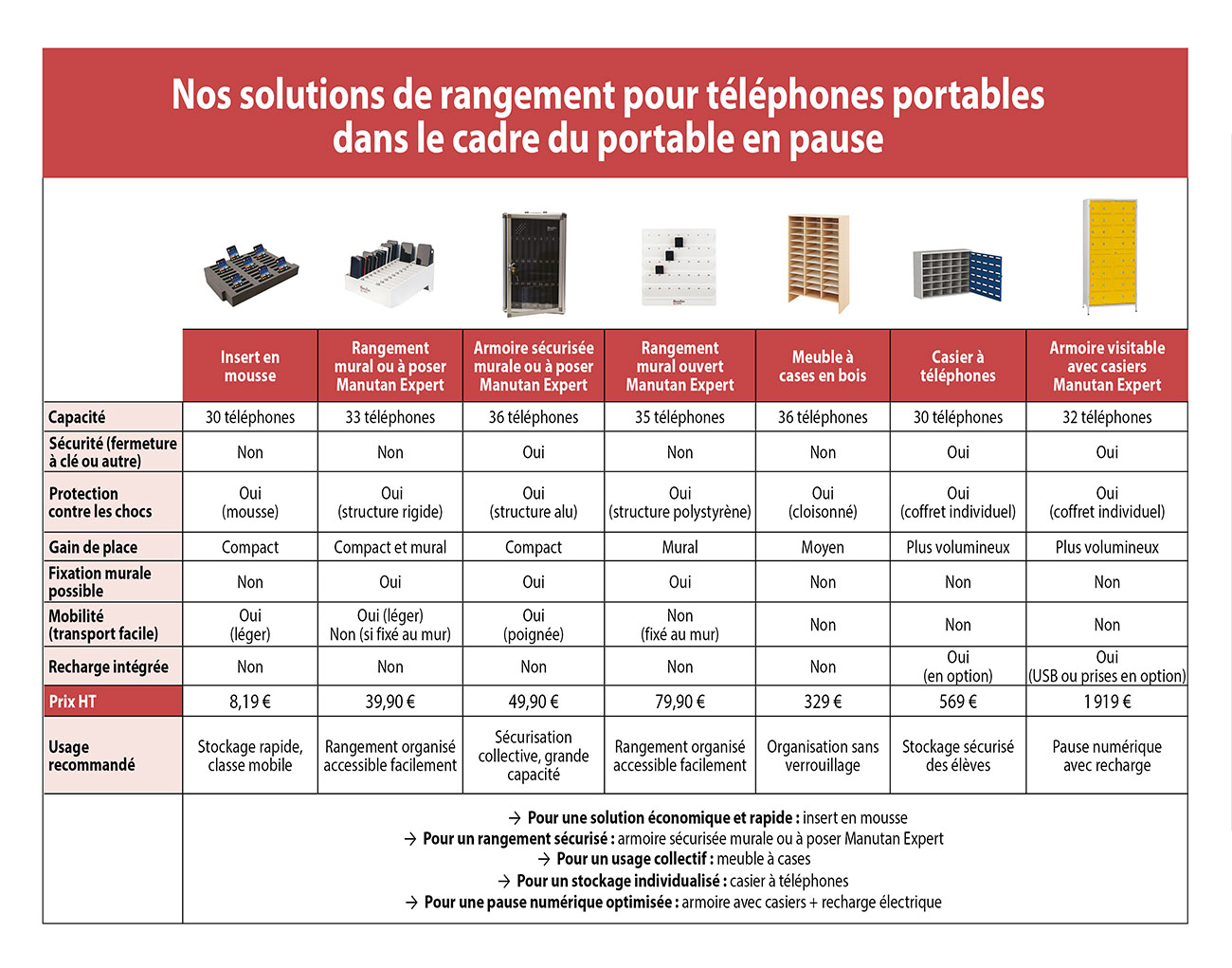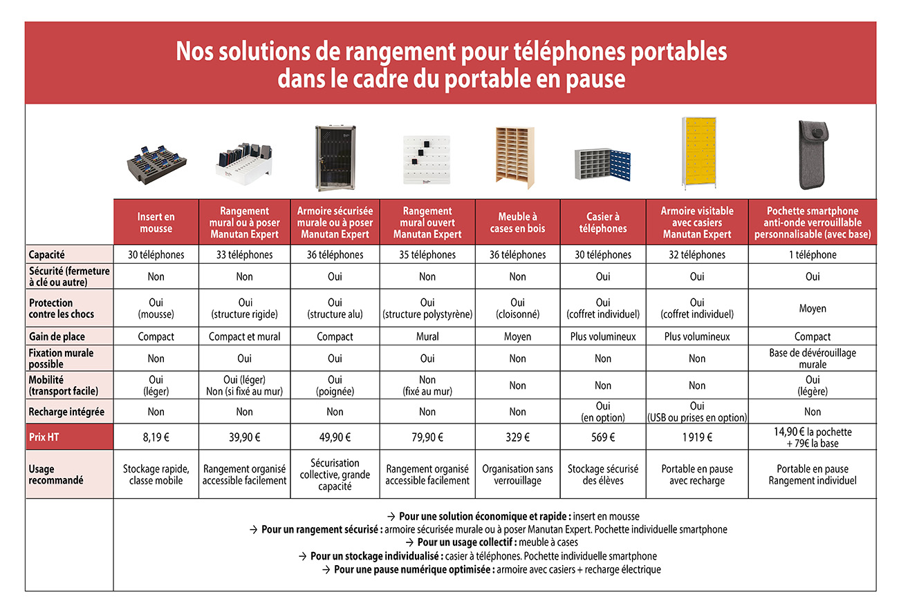 Pour les équipes pédagogiques, ce n’est pas si simple. Comment collecter les téléphones ? Où les ranger de manière sécurisée ? Comment financer les équipements nécessaires à ce dispositif ?... Manutan Collectivités vous accompagne une fois de plus pour instaurer la nouveauté dans votre établissement scolaire.