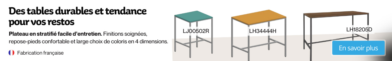 Avec son design et ses caractéristiques particulières, le mange-debout s’est depuis longtemps imposé comme une valeur sûre dans les espaces de restauration, aussi bien dans les établissements publics qui proposent ce type de prestation qu’auprès des professionnels de la restauration. Pour les responsables de l’ameublement des espaces de restauration au sein des établissements gérés par les collectivités (écoles, centres hospitaliers, etc.), il ne s’agit pas seulement de surfer sur la tendance. En pratique, le mange-debout présente de nombreux avantages, parmi lesquels le gain d’espace. Le mange-debout affiche en effet un encombrement plus limité qu’une table de restaurant.Un large choix de modèles de mange-deboutPreuve de son succès, le mange-debout se décline aujourd’hui sous une multitude de modèles. Du mange-debout Malibu en stratifié au mange-debout Canada en acier en passant par le mange-debout Bolonia rectangulaire, il existe quantité de modèles différents pour répondre à toutes vos exigences. Dans cette rubrique dédiée au mange-debout, Manutan Collectivités vous offre un accès à plusieurs dizaines de modèles. Grâce aux filtres de recherche, Manutan Collectivités vous aide à trouver plus facilement le mange-debout qui s’intégrera le mieux à votre espace de restauration. Coloris, dimensions, matériaux, budget… à vous d’affiner votre sélection en fonction de vos besoins. À noter que tous répondent à des exigences en termes de qualité et de durabilité. Manutan Collectivités vous garantit un achat et une livraison de votre mobilier pour espace de restauration en toute sérénité.