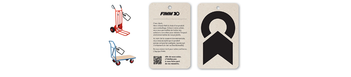 Sur une sélection de produits majeurs de la manutention, la livraison se fera sans emballage et une étiquette cartonnée (matière recyclée & recyclable) sera apposée pour vous informer, vous remercier de votre contribution et valoriser votre geste en faveur de l’environnement.