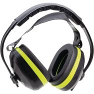 - Casque anti-bruit double arceau muni de coquilles en ABS noir et jaune fluo.