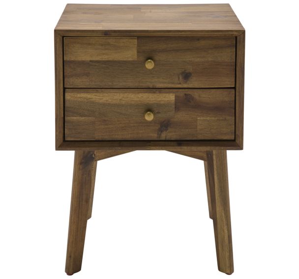 - Chevet en acacia massif, 2 tiroirs, boutons de tiroir en laiton vieilli.