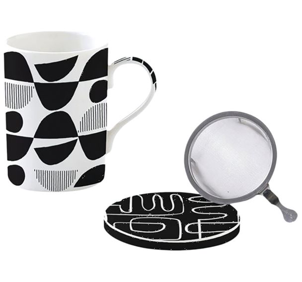 - Coffret cadeau décoré comprenant : 1 mug porcelaine 35 cl (diamètre 8 cm, hauteur 11 cm), 1 infuseur en inox à maille fine et 1 couvercle porcelaine de diamètre 9 cm