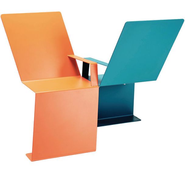 - Cette double chaise en acier plié, finition laquée, propose une double assise souple, invitant à la détente, au relâchement, voire au repos.