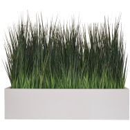 Graminées assemblées dans un pot en fiberstone blanc, habillage de finition écorce de pin.