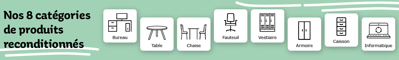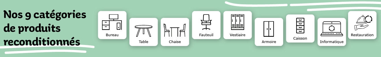Avec l’offre seconde vie, vous pouvez choisir du mobilier parmi une sélection de produits reconditionnés, classés en 8 catégories :